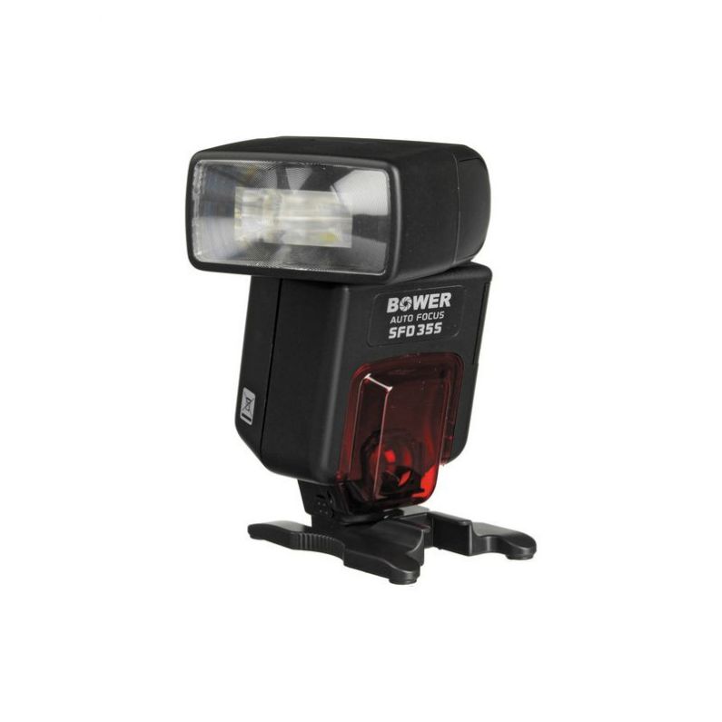 The Bower SFD35 Digital Auto-Focus Flash is a fully dedicated ADI / P-TTL program flash designed to work with the Sony/Minolta cameras for improved flash photography. Designed with professional and amateur photographers in mind, the SFD35 flash is equipped with a guide number of 112' and has a zoom range of 28-85mm. Also the head will tilt upward 90° and rotate right 150° and left 180°. An AF assist light is available in low light situations and it has a recycle time of 4-6 seconds at full power. Additionally, it runs on 4 AA batteries. This model comes equipped with the Sony/Minolta style hot shoe and is not compatible with Sony's Multi-Interface Shoe.