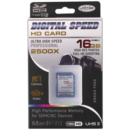 Capture Full HD, 3D, and 4K content with the Digital Speed 2500X 16GB Professional High Speed Mach III 350MB/s Error Free (SDHC) HD Memory Card Class 10 Memory Card. Each of the included SDXC memory card meets the UHS Speed Class 10 specification with maximum data speed of 350 MB/s. While this card is designed to meet the needs of those requiring enhanced data transfer rates, it remains backwards compatible with devices requiring UHS-II, Class 10 memory cards.