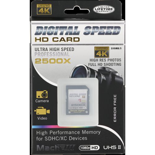 Capture Full HD, 3D, and 4K content with the Digital Speed 2500X 1TB Professional High Speed Mach III 350MB/s Error Free (SDHC) HD Memory Card Class 10 Memory Card. Each of the included SDXC memory card meets the UHS Speed Class 10 specification with maximum data speed of 350 MB/s. While this card is designed to meet the needs of those requiring enhanced data transfer rates, it remains backwards compatible with devices requiring UHS-II, Class 10 memory cards.