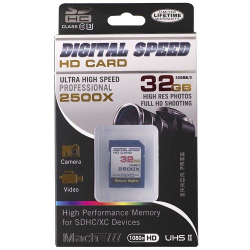 Capture Full HD, 3D, and 4K content with the Digital Speed 2500X 32GB Professional High Speed Mach III 350MB/s Error Free (SDHC) HD Memory Card Class 10 Memory Card. Each of the included SDXC memory card meets the UHS Speed Class 10 specification with maximum data speed of 350 MB/s. While this card is designed to meet the needs of those requiring enhanced data transfer rates, it remains backwards compatible with devices requiring UHS-II, Class 10 memory cards.