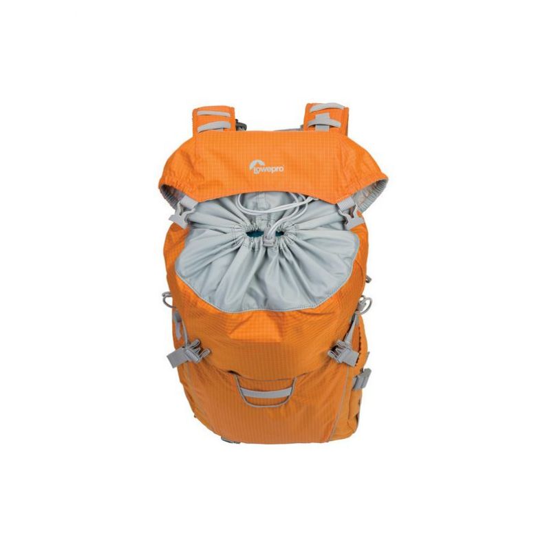The orange Photo Sport 200 AW Backpack from Lowepro is a lightweight pack designed for heavyweight outdoor action and manufactured to handle a rugged trail race, mountain bike outing or photo trek up a local peak. Made from triple rip stop nylon, the Photo Sport 200 not only holds your DSLR with attached lens, but a flash as well in its dedicated Ultra-Cinch Camera Chamber side-access pocket. This Chamber compliments the dual compartment approach to the pack that permits you to carry both clothes, food and camera gear.