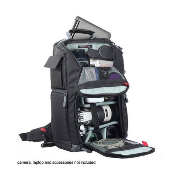 The black Photo Sling Backpack 12 from Vivitar holds a DSLR, two lenses, and a flash between padded, touch-fastened dividers inside the main camera compartment at the base. It will also accommodate a tablet in a dedicated zippered compartment at the back. The backpack features partially detachable shoulder straps that can be reconfigured to be worn as either a left or right-accessed sling.